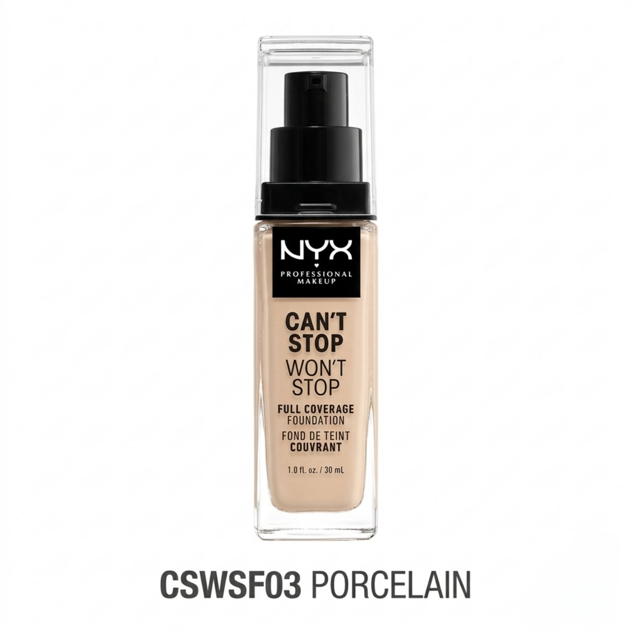 فاونديشن NYX Can’t Stop Won’t Stop بدرجة CSWSF03 Porcelain هو فاونديشن بيوفر تغطية كاملة عالية جدًا مع لمسة نهائية مطفية بتتحكم في اللمعان طول اليوم ✨